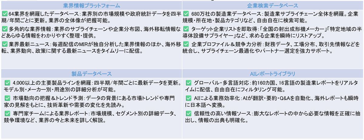 MIR DATABANKは、製造業に特化したオンラインサービスです。MIRコンサルタントがフィールド調査、公開情報収集、現地情報収集を行い、定期的に情報更新しているため、製造業の最新情報を入手することが可能です。